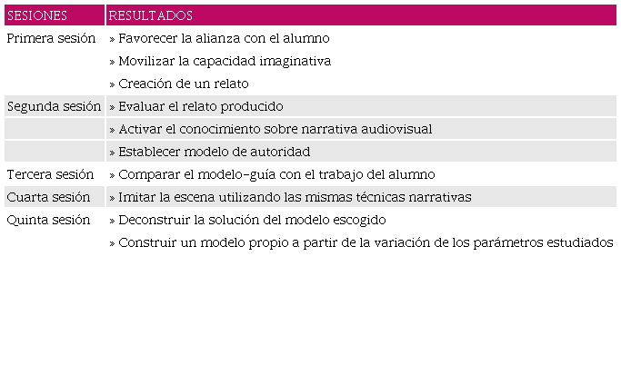 La segunda sesión tiene por objetivo evaluar el relato producido a partir de una serie de preguntas con las que se pretende dar forma a ese relato y, de paso, activar el conocimiento sobre narrativa audiovisual. Los términos y conceptos que se intentan activar están referidos a la escena que servirá como modelo de análisis, imitación y experimentación. Las preguntas se relacionan con los conceptos de historia y discurso, puesta en escena, planificación del punto de vista y relación con el espectador (vid Anexo I).