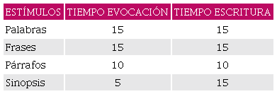Se lee una palabra con su descripción y las preguntas asociadas. Después se dejan veinte segundos para imaginar y anotar algo de lo que se ha visto mentalmente en un formulario preparado con anterioridad y subido a la plataforma. Tras leer los ítems de una etapa (por ejemplo, todas las palabras), el profesor los muestra en un power point por escrito y se deja al alumno que trabaje en esos ítems durante un tiempo determinado (quince minutos) intentando darles sentido en un esbozo de relato.