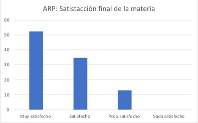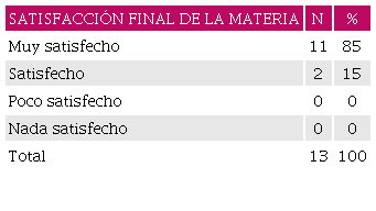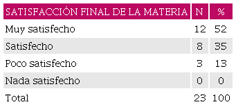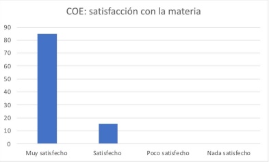La mayoría de los alumnos de ambas materias apuntaron que estaban satisfechos con su curso: 87% para Argumentación, (52% “muy satisfechos”, y 35% “satisfechos”), y 100% para los alumnos de Comunicación Escrita (85% “muy satisfechos”, y 15% “satisfechos”).