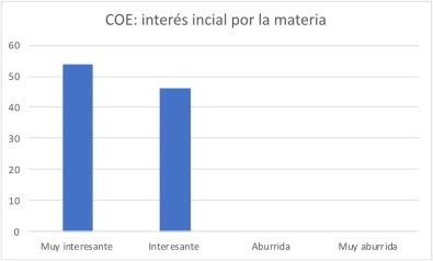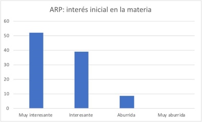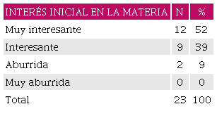 Al inicio del curso, ambos grupos mostraban interés por la materia. Los resultados positivos suman 91% para Argumentación, y el 100% para Comunicación Escrita.