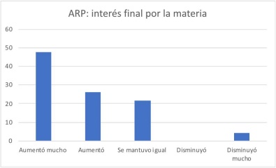 Asimismo, los alumnos de ambas materias en su mayoría señalaron que su interés por la materia había aumentado: 74% de los alumnos de Argumentación y 100% de los alumnos de Comunicación Escrita. Pero, en el lado opuesto, para el 26% de los estudiantes de Argumentación, su interés “se mantuvo igual” (22%) o “disminuyó mucho” (4%).