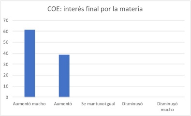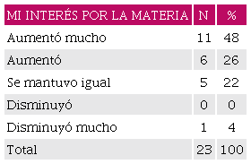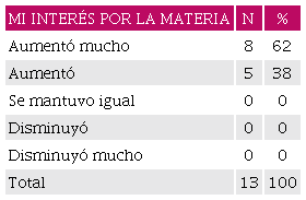 Parte esencial para medir la aceptación de estas dinámicas es el cambio en el interés por la materia. Los resultados también fueron favorables. En general el 74% de los alumnos de Argumentación señalaron que su interés aumentó (26%) o aumentó mucho (48%); mientras que el 100% de los alumnos de Comunicación Escrita indicó que aumentó (38%) o aumentó mucho (62%).