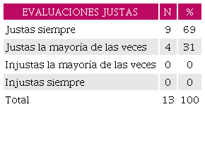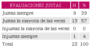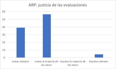 Aunque en ambos grupos hay una percepción favorable en la justicia de las evaluaciones, la relación fue inversa. La mayoría de los alumnos de Comunicación Escrita (69%) percibieron las evaluaciones como “Justas siempre”; mientras que la mayoría de los alumnos de Argumentación (57%) las percibieron como “Justas la mayoría de las ocasiones”. El resultado es interesante puesto que en ambos grupos se usaron casi las mismas estrategias (evaluación del docente, evaluación por pares). La única diferencia es que la evaluación de pares en Argumentación era grupal (todo el grupo evaluaba), mientras que la evaluación de pares en Comu Comunicación Escrita era individual (el trabajo era evaluado por 3 compañeros).