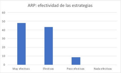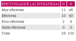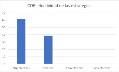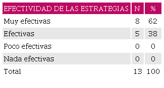 Lo mismo ocurrió con la percepción de la efectividad de estas estrategias: para el 91% de los alumnos de Argumentación estas estrategias les parecieron “muy efectivas” (48%) o “efectivas” (43%); y sólo para el 9% les resultaron “poco efectivas”. Para el caso de Comunicación Escrita, el 62% las evaluó como “Muy efectivas” y el 38% como “efectivas” sin resultados negativos.