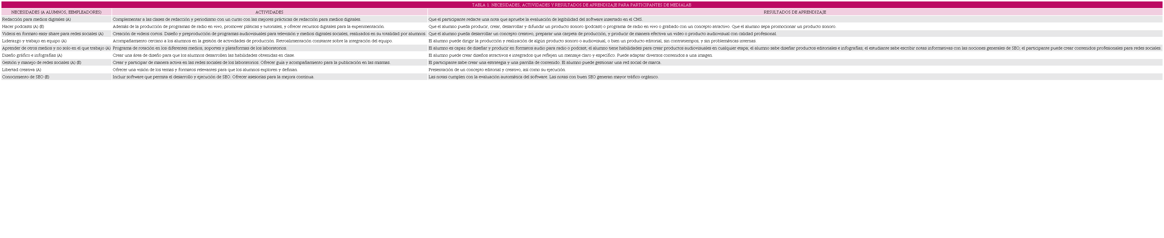 Para tener un estimado de las necesidades se realizaron entrevistas semiestructuradas con directivos y editores de medios, así como con los becarios que trabajaban en MediosUP. Esto dio origen a un primer listado de habilidades y competencias, que en la heutagogía se conoce como contrato de aprendizaje (Blaschke y Hase, 2015) y al establecimiento de los resultados que los participantes deberían tener y, aunque la primera aproximación de MediaLab fue empírica, se establecieron los pasos de un proceso de diseño heutagógico (Blaschke y Hase, 2013). La tabla uno muestra las necesidades identificadas, las actividades para promover el desarrollo y los resultados de aprendizaje.