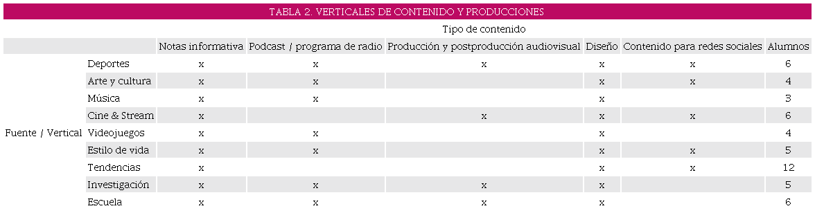 La asignación a las verticales dependía del trabajo previo que el alumno hubiera realizado, el interés que tuviera por un tema específico, y su nivel de profesionalismo con respecto a las necesidades del área. Por ejemplo, si la vertical de arte quería crear un podcast, pero en el equipo no había un elemento con esas habilidades desarrolladas, se le proponía a alguien, con más experiencia, que apoyara y enseñara a sus compañeros a crear un producto sonoro.