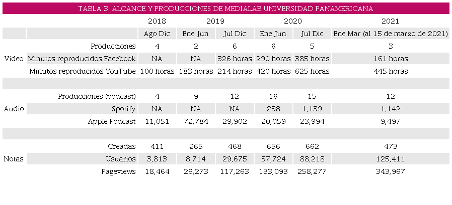 Los resultados numéricos en cuanto al alcance de usuarios, reproducciones de video, escuchas de podcast, páginas vistas creció con la ejecución de este modelo. La tabla 3 muestra los avances.