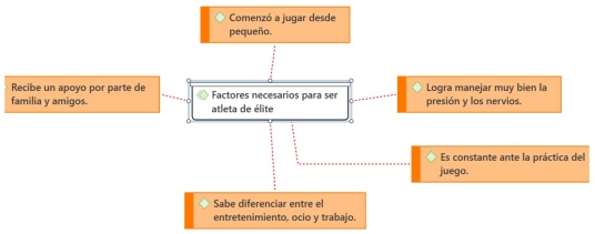 Los factores que los entrevistados mencionaron como fundamentales para ser o llegar a ser un atleta de élite pueden visualizarse en la Figura 2. Los entrevistados mencionaron que para consolidarse en el juego la mayoría comienza a jugar desde pequeños, recibe apoyo por parte de familiares y amigos, logra manejar la presión y los nervios, sabe diferenciar entre el entramiento, ocio y trabajo y es constante. Desde la visión de los entrevistados la constancia es un factor que genera resultados.