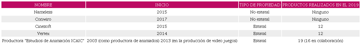 Se identificaron inicialmente cuatro actores estatales y dos no estatales, los que fueron entrevistados en los primeros cuatro meses del 2020. Hay un quinto actor que también produce videojuegos, EVIMA, perteneciente a la empresa de Joven Club. Pero esta empresa no comercializa sus videojuegos, sino que los distribuye gratuitamente a través de un sitio web, sin modelos de monetización. Por ello no entró en el siguiente momento de la investigación. La entrevista posterior con los actores seleccionados procedió a levantar información acerca del año de inicio, productos realizados, tamaño, número de trabajadores, ventas, exportaciones y otros datos económicos. La información básica de los actores identificados se muestra en la siguiente tabla: