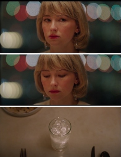 La primera secuencia en la que se contempla este ritual es en la cena en la que celebran el embarazo de Hunter (Figura 1). Ella es invitada a hablar en público a pesar de que siente muchos reparos en hacerlo. Cuando al final de decide cuenta una anécdota, se siente ignorada. Ella siente el agravio de verse excluida (frame de indignación, Figura 1.1) por la interrupción del suegro. La mirada de Hunter (Figura 1.2) correspondería al modo en que se crea un frame de identidad (ella frente a ellos) que se resuelve refugiándose en contemplar el vaso con hielo (frame de agencia, Figura 1.2 y 1.3). Después lo mastica sin atender a la conversación de la familia. Es obvio que la forma en que categorizamos los frames no son tan profundos y conscientes como los que expone Gamson. Por eso trataremos de retomar esta cuestión en las conclusiones.