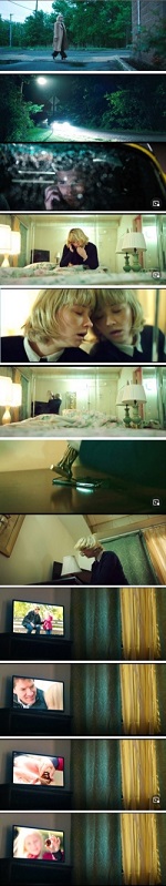 Tras escapar del internamiento en un psiquiátrico, Hunter se refugia en un motel (Figura 11). Allí recibe una llamada de Richie. La pregunta sobre si ella consigue romper con su marido se resuelve aquí. En esa conversación, Richie le revela lo que realmente piensa. Solo quiere a su hijo; ella es una “desgraciada y desagradecida”. Ella confiesa que le sigue queriendo y que aceleró cosas por él, la casa, el bebé. No pretendía ser madre sin estar segura, pero la pudo la presión. Destruye el móvil para denotar la ruptura de la comunicación con el exterior. De un plano general en espejo con una lámpara, pasamos a otro detalle y después a otra variación en el plano contrapicado. Después se queda embobada comiendo tierra y mirando un anuncio comercial en la televisión de un padre y una niña, Hunter cambia de expresión y deja de comer tierra. Tras ver la cara de la niña enfocada sobre la bola, volvemos al plano de ella, como si hubiera entendido algo. Es muy importante este tipo de historias visuales contadas así porque nos permite entender como espectadores qué sienten los personajes. El relato que cuenta de la televisión es un relato dentro de otro, dentro de su relato personal.