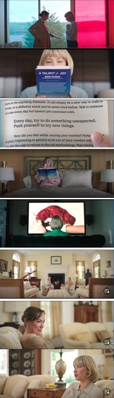 ¿Qué quiere la suegra de Hunter? Enseñarle cómo debe comportarse si quiere ser la mujer de su hijo y la madre de su nieto. Estas operaciones se llevan a cabo por parte de toda la familia, pero la madre es el referente principal. La suegra le regala un libro para que sepa cómo debe actuar frente al embarazo (Figura 12.1). Hunter sigue sus órdenes y se prepara para el parto, leyendo el libro (Figura 12.2, 12.3), de hecho, tragándoselo literalmente (12.4) y viendo documentales sobre la placenta (Figura 12.5). También la invita a su casa para seguir con la labor de adoctrinamiento (Figura 12.6-12.8). Y le pregunta por su pasado para hacerle ver que está en deuda, porque ella no es nada sin la familia. De un modo cínico, la suegra le da el mejor consejo que le dieron a ella: “Finge [ser feliz] hasta que lo consigas” (“Fake it till you make it”). Para a continuación rematar preguntándole si ya es feliz o aún está fingiendo.