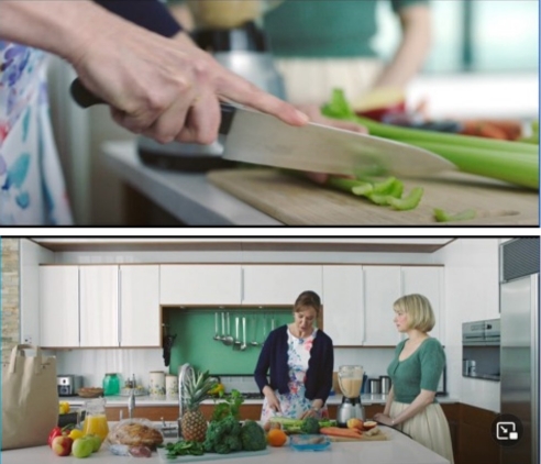 La suegra se arroga el privilegio de diagnosticarla y ponerle un tratamiento: “Ahora tu cuerpo está hambriento, pero le envía el mensaje equivocado al cerebro acerca qué comer. Lo que haremos será reconectar la mente y el cuerpo”. Se nos introduce en la escena a través de un plano en el que está cortando verduras (Figura 13.1). De modo paternalista, le señala cómo abordar y solucionar su trastorno (Figura 13.2). La infantiliza proponiendo que tome alimentos ricos en hierro para no tener que tragar objetos de metal.