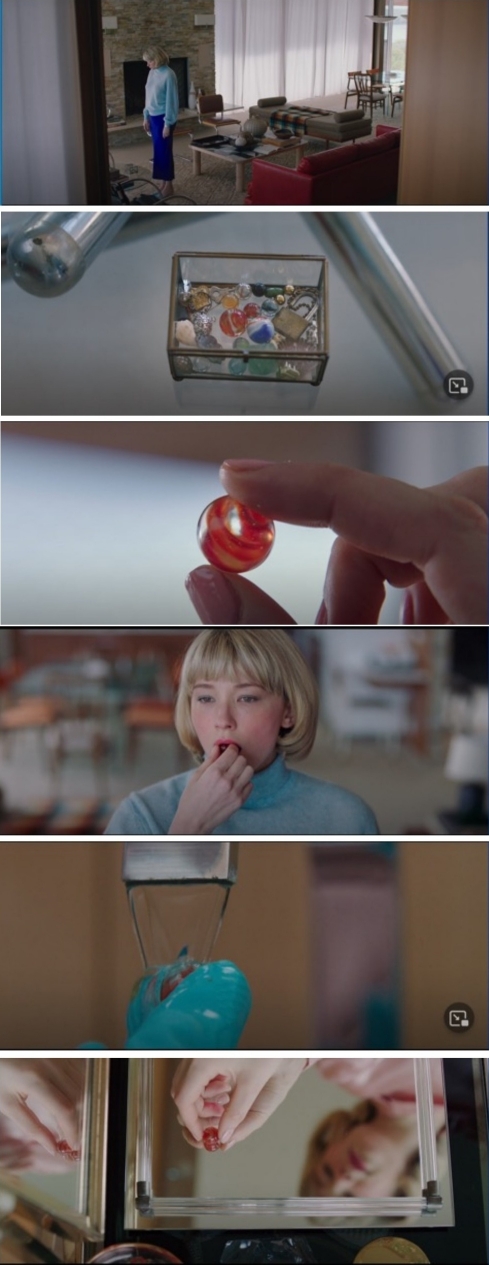 En una escena posterior, Hunter se siente mal mientras está mirando cómo están en la piscina (Figura 3.13). Va al baño y vemos, no cómo defeca, sino el resultado de ello en un plano de la sangre en la taza del váter (Figura 3.14). Esto es otro elemento de estilo. No mostramos las acciones sino las consecuencias de las acciones. Cuando termina de rescatar la chincheta, la coloca junto con el primer reto, la canica (Figura 3.15). Ha conseguido tragarse dos objetos y expulsarlos el resultado después de digerirlo, gestarlo, a pesar del dolor, como haciendo un ensayo de lo que vendrá después.