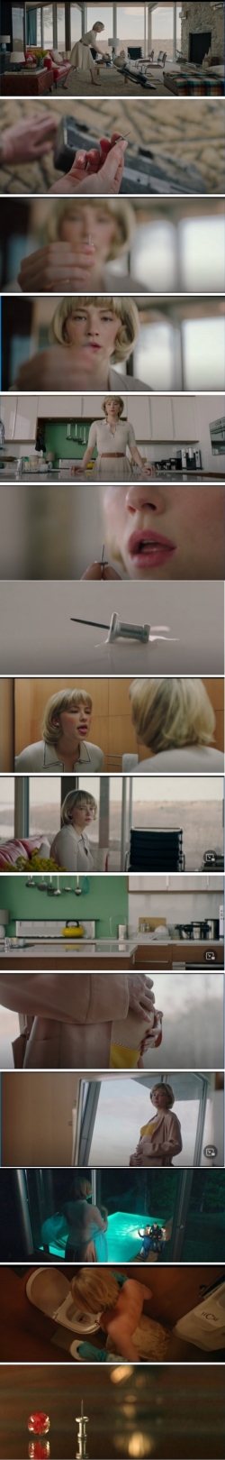 Se rompe la dialéctica mirada-objeto cuando ella decide levantarse y pasar a la acción. Lo hace como una compulsión. Con cámara al hombro, la música tiene un abrupto final y ella se levanta para dirigirse hacia la chincheta y tragarla. La cámara al hombro da la sensación de acción, de inevitabilidad del deseo de tragar, como si de un impulso sexual ante un objeto de deseo inevitable. Después se lleva las manos al vientre acariciándolo como si de una embarazada se tratase; parece obvio que la chincheta representa el pene que la dejará embarazada.