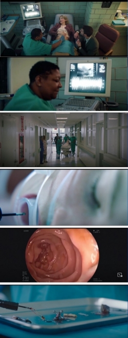 A pesar de la expresión de felicidad que ambos tienen y expresan con sus miradas mutuas, la médica señala que hay algo que no está bien (Figura 4.2). Hay un corte en movimiento, la cámara cierra el plano sobre ella en una camilla, rodeada de enfermeras y médicos (Figura 4.3). De ahí se pasa al plano de ella anestesiada mientras le extraen objetos. Enfoque-desenfoque sobre las tenazas para capturar los elementos, ella desenfocada (Figura 4.4). Hay una música de coro angelical, que encaja bien con la idea de anestesia y pérdida del conocimiento, inocencia, serenidad. Sigue la imagen de la endoscopia (Figura 4.5) y con una profundidad de campo mínima se enfocan los objetos tragados y no defecados (Figura 4.6).