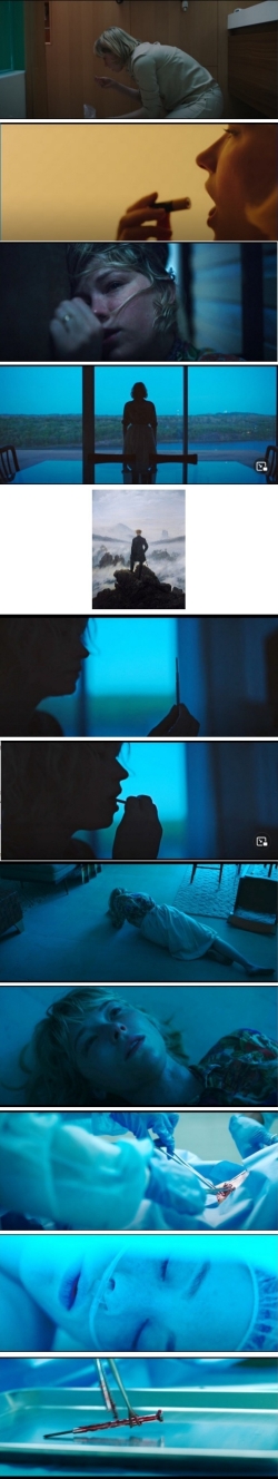 Ese equilibrio se rompe cuando Hunter descubre que su psicóloga está filtrando a Richie la información que ella revela en las sesiones, el secreto de que ella es fruto de una violación. Aquello le hace estresarse y se esconde bajo la cama (Figura 5.3). Se queda dormida y al despertar va al salón y compone un plano romántico melancólico (Figura 5.4), como un cuadro de Caspar David Friederich (Figura 5.5). Le viene a la mente un destornillador de precisión. Hunter pasa a la acción y para contrastar con el plano melancólico anterior se usa la cámara en mano. Busca algo contundente con lo que lesionarse (Figura 5.6, 5.7). Se atraganta mientras que el cuidador despierta y percata de que no está bajo la cama. De nuevo, de urgencias en el hospital.