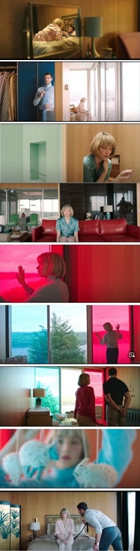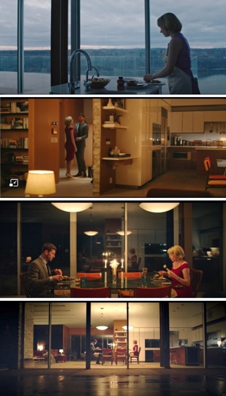 Después de esa primera escena de presentación de personajes en la cena, se pasa a una secuencia en la que se describe con más precisión el tipo de interacción entre la pareja. Hunter espera que su marido llegue de trabajar y prepara para él la cena (Figura 8.1). Lo hace con meticulosidad y perfeccionismo, quiere ser la esposa ideal tradicional. Cuando llega corre a recibirlo y pasan a cenar (Figura 8.2). Él alaba la cena que le ha preparado. Ella intenta mantener una conversación, pero él está pendiente de sus negocios a través del móvil. Comprobamos que los comentarios que ella hace sobre el jardín, no le importan demasiado a él, que come de modo mecánico y presta la atención justa para parecer que está conversando. Cada uno mira su plato (hay resonancias de Ciudadano Kane). La composición del plano es simétrica e inmaculada, con el reflejo que les devuelve el ventanal (Figura 8.3) y que denota la soledad entre ellos. Para completar la sensación de aislamiento de la pareja, la secuencia se completa con un plano desde fuera de la estancia (Figura 8.4) que muestra su impoluto aislamiento del mundo, de la sociedad. Este aislamiento es central a lo largo de todo el relato de cara a entender cómo se configura su problema social, como algo individual y no colectivo.