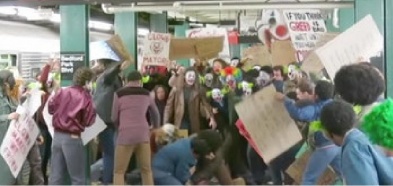 “If you think GREED is bad, wait until you hear about CAPITALISM,” reads one of the signs (see fig. 4) displayed by a violent group of protestors wearing Joker masks towards the end of the film. Like many others in the movie, these protestors embrace the titular character and his message.