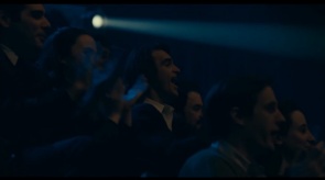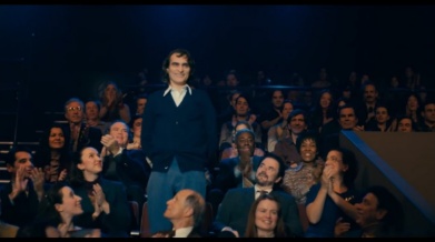 Initially, Arthur is as an ardent fan of the show “Live with Murray Franklin.” Watching the show becomes a ritual for both him and his mother. In one scene, while watching the show, Arthur imagines himself as one of the live audience members (see fig. 6 and 7). In his imagination, he gets called out by Murray (the talk show host) for his enthusiastic clapping and praise. The lights fall on Arthur, giving him the attention he seeks (see fig. 8):