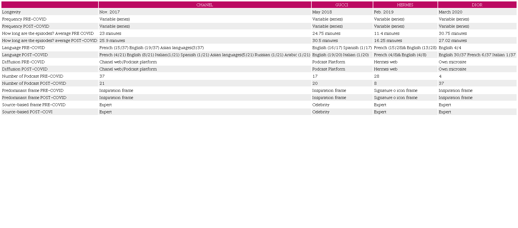 It is striking to observe how the fashion luxury brands have not made significant post-pandemic changes in their podcasts. At the same time, in the fight against the pandemic, luxury brands have pledged financial donations and manufacturing of medical supplies (Aloisi, 2020; Davis, 2020). At a quantitative level, in terms of frequency, Chanel and Hermes took a break of more than a year; on the other hand, regarding the duration of the episodes, there was no significant modification. On a qualitative level, there has not been a global evolution in languages and in the framework either. All have followed the same scheme that they had before COVID.