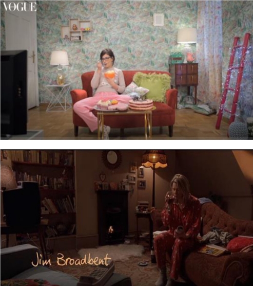 En tercer lugar, el último signo que fortalece la lectura intertextual es la estética kitsch, presente tanto en el cortometraje como en varias comedias románticas. Antes de detallar cómo funciona este rasgo, vale recordar que el vídeo de Vogue tiene una finalidad publicitaria y, según apunta Rey (1995), la publicidad es una actividad que recurre constantemente a referentes previos para imitarlos y adaptarlos a sus necesidades. Particularmente abunda la estética kitsch en los contenidos de moda, pues, de acuerdo con Eco (1988) lo kitsch se limita a coger elementos digeribles de la vanguardia y a construir con ellos mensajes vendidos como arte. Esta práctica, alineada con la industrialización en la moda, es, como el pastiche, una “imitación neutra de un estilo particular” (Jameson, 2002, p. 77).