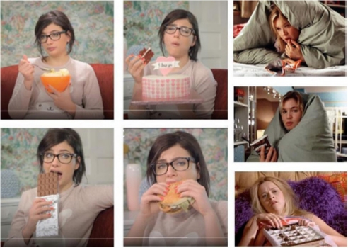 El primer signo es la comida, más específicamente, la práctica de lo que la medicina ha llamado emotional eating. Geliebter define esto como un patrón insano de alimentación relacionado con la inestabilidad emocional (Geliebter y Aversa, 2003), en el que la comida es vista como una forma de lidiar con emociones negativas (Goossens et al., 2009; Johnson y Wardle, 2005). En el caso de las comedias románticas, destacan las escenas de películas como Bridget Jones’s Diary y Legally Blonde (2001). En ambas, al igual que en el cortometraje, las protagonistas se atracan con comida chatarra. A través de esta acción, los personajes lidian con sus emociones, particularmente con la tristeza y la frustración causadas por el fracaso en las relaciones amorosas.