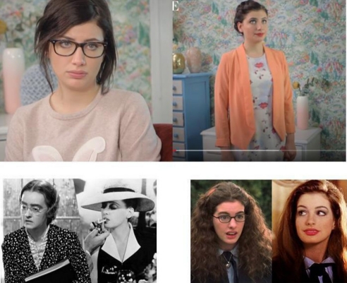 En segunda instancia, el tópico de la metamorfosis femenina ha sido repetido por Hollywood constantemente (Ford y Mitchell, 2004). Particularmente relevante es este signo en un vídeo producido por una publicación de moda, cuyo objetivo es vender un canon de belleza a sus lectoras. En este sentido, citada como película modelo del género makeover, Now, Voyager (1942) utilizó para su promoción la imagen del vestuario necesario para que la protagonista, Bette Davis, interpretara a su personaje antes de la transformación de “un patito feo a un bello cisne”. Los rasgos físicos con los que se caracterizó a Bette Davis, anteojos y pesadas cejas falsas, formaron más tarde una especie de código para las películas posteriores, como Ella es así (1999) y El diario de la princesa (2001), que explotan el tópico del cambio de imagen.