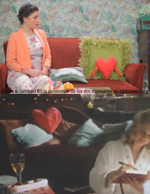 Como se observa en el cortometraje, sin embargo, esto no sucede así. Por el contrario, todas las escenas, tanto las del presente diegético como las analepsis, ocurren en el espacio íntimo. Esto tiene que ver no directamente con una ruptura de las convenciones de las comedias románticas, sino con la Teoría de la estratificación de género (Lenski, 1966), la cual explica que la posición de las mujeres dentro de la sociedad ya sea poder, dinero o clase, se relaciona con la segregación espacial en tanto que los arreglos físicos existentes facilitan o inhiben el intercambio de conocimientos entre aquellos con mayor y menor poder (Spain, 1993). En este caso, la trama se centra en la experiencia de Sol, y a través de la localización del personaje en el escenario se alude a películas de este género que también retratan a la mujer en espacios íntimos, particularmente el salón, porque son sitios donde pueden expresar su frustración. Una de las referencias más claras sobre la construcción de este escenario es la película El diario de Bridget Jones, como se muestra en la figura 3, el salón de ambos films se compone de forma muy similar: el sofá frente al televisor, algunos elementos decorativos como la lámpara y los muebles, pero sobre todo destaca la posición de ambas protagonistas, su actitud derrotada y su acción consumidora, una de helado y otra de vino, al observar comedias románticas en la pantalla. De esta manera, el emplazamiento femenino en el gendered space del hogar refuerza y reproduce las distinciones de estatus predominantes de la sociedad patriarcal, lo cual mantiene la estratificación imperante en la que el conocimiento socialmente valorado se distribuye desigualmente entre mujeres y hombres.