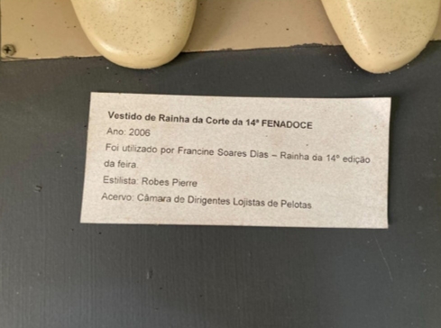 El pie de foto del vestido (Figura 2) informa que perteneció a la Reina de la Corte de la XIV FENADOCE, que tuvo lugar en el año 2006. También se informa el nombre de la reina, así como el nombre del diseñador, y por último, a qué colección pertenece. El vestido forma parte de la Cámara de Comerciantes de Pelotas - CDL.