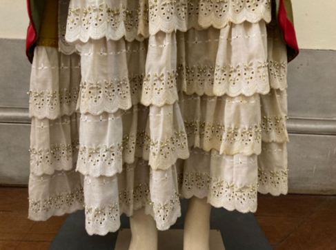 Lo poco que sabemos de este vestido, a través de la leyenda en la base (Figura 2) nos recuerda lo que dice Brulon (2015), sobre cuando visualizamos un objeto expuesto, este mismo objeto se limita a las palabras que se eligieron para ser expuestas definiéndolo. Si se piensa a partir de la clasificación de la vestimenta dividida en tres desarrollada por Roland Barthes (1981), donde la primera hace referencia a la vestimenta escrita y su descripción verbal; el segundo sería la imaginería de la indumentaria a través de la fotografía o el dibujo; y la tercera, la vestimenta como objeto real donde se encuentran las marcas de las acciones del tempo. Así como información evidentemente productiva, y en relación con el objeto musealizado en cuestión, identificamos cómo las tres formas se complementan entre sí.