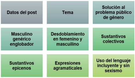 También nos propusimos comprender las orientaciones que la candidata imprimió a sus mensajes en la red sociodigital, con el objetivo de identificar si incluyó algunos elementos que la pudieran identificar como una promotora de un lenguaje incluyente y sin sexismo, así como determinar si podía desafiar estereotipos de género culturalmente arraigados. Esto fue crucial, ya que, como personas estudiosas de los discursos políticos en época de campaña, buscamos que quienes están destinados o destinadas a ejercer un puesto público tengan entre sus prioridades el tema de género; al contrario de continuar perpetuando posturas sexistas que arraiguen más una desigualdad basada en roles de género.