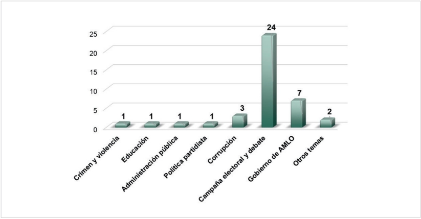 Determinamos que en más del 50% de las publicaciones consideradas en la muestra, iba encaminado al tema de campaña electoral y debate, el lenguaje incluyente y no sexista no fue aplicado de forma uniforme dentro de estos tweets, puesto que únicamente fue utilizado de forma concreta en un 42.5%, y de forma parcial en un 25%, en contraste con esto en el 45% se hizo uso del masculino genérico englobador, en el 52.5% de los tweets, se pudo observar el uso del desdoblamiento en masculino y femenino, sólo en el 5% de ellos se pudieron observar expresiones agramaticales.