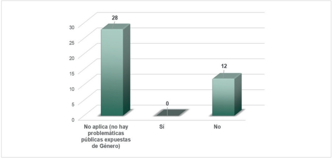 Como se puede visualizar, de las 40 publicaciones, en 28 (70%) no hubo problemáticas públicas expuestas, ya que no trató temas concernientes a la categoría género. Asimismo, en relación con dichos resultados y en contraste con la categoría “Tema”, ella hizo alusión en estos 28 textos a otras problemáticas vinculadas con diferentes temas como corrupción, políticas partidistas, administración pública, entre otras; pero ninguna vinculada con género. Podemos constatar lo anterior en los siguientes ejemplos:
