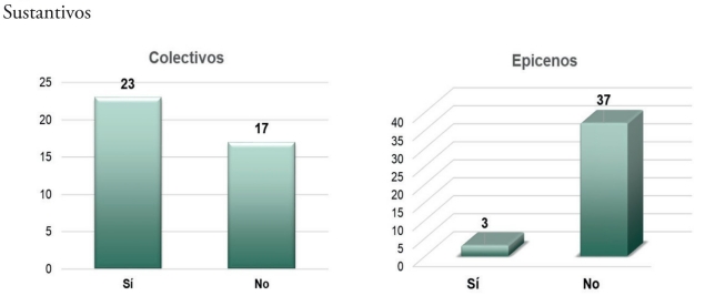 Los mensajes de Gómez estuvieron acompañados de sustantivos colectivos y epicenos, con palabras que hacen referencia a las mujeres y a los hombres (Guichard, 2018, Bosque, 2012). En 23 de las 40 publicaciones (57.5%) los sustantivos colectivos estuvieron presentes, mientras que los epicenos fueron empleados en tres ocasiones (7.5%), como se muestra en las siguientes gráficas: