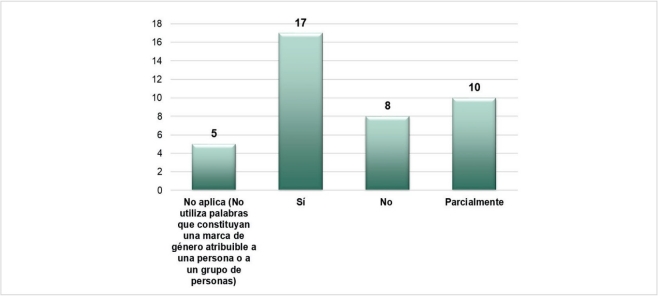 Consideró la utilización de un lenguaje incluyente y sin sexismo en 32 mensajes (80%), aunque en algunos casos fue parcial, es decir, apeló a una combinación de este lenguaje, con el masculino genérico y en otros se expresó en términos que no mostraron alguna marca sexista, con la utilización, por ejemplo, de las siguientes frases: “son ustedes quienes nos impulsan a cambiar y crear”, “Da lo mejor de ti y llena de alegría a quienes te rodean”. Sus publicaciones emplearon en menor medida el masculino genérico, además recurrió a los desdoblamientos de sustantivos, adjetivos y pronombres; también utilizó los sustantivos colectivos y epicenos.