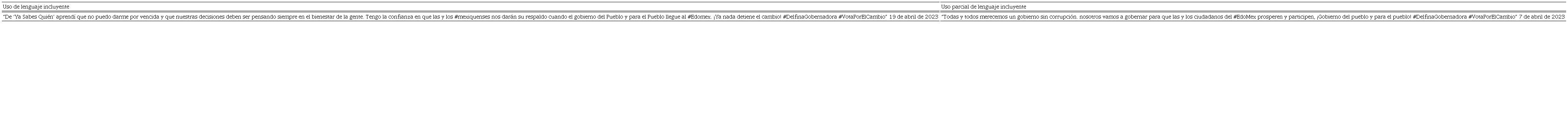 De los 40 tweets, la candidata a gobernadora, en 17 ocasiones (42.5%) utilizó un lenguaje incluyente y sin sexismo y en 10 (25%) lo hizo de forma parcial.