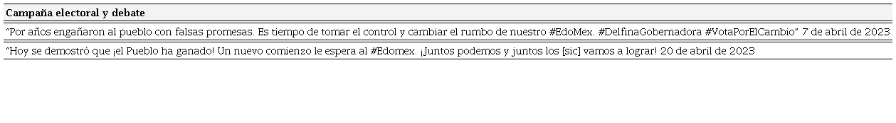 El tema hacia donde la candidata encaminó sus publicaciones fue campaña electoral y debate, con un total de 24 tweets (60%). A continuación, presentamos dos ejemplos: