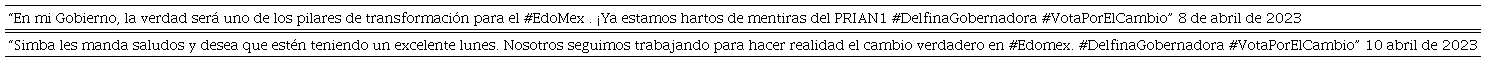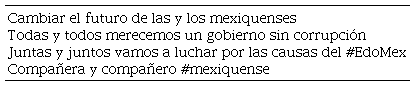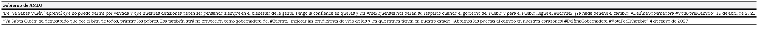 Si a nuestros argumentos agregamos que en seis de las 40 publicaciones hizo alusión a la personalidad y forma de gobierno del presidente Andrés Manuel López Obrador, al cual evidenció con la frase “Ya sabes quién”, se presentó como una candidata que requiere algún tipo de apoyo masculino en el planteamiento de sus propuestas de gobierno y en pensar cómo ejercer su puesto como funcionaria pública. En sus mensajes persisten raíces fuertemente arraigadas de una cultura heteropatriarcal que han impedido históricamente gozar de otra forma de elaborar nuevos contenidos para una socialización de género igualitaria.