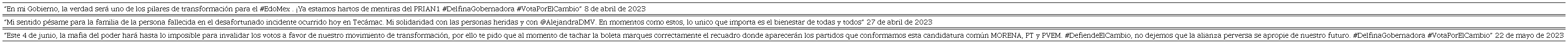 El INE (2023b) mostró en su página de Internet las tres propuestas de campaña de la candidata Gómez, una centrada en: Seguridad y erradicación de la violencia; la otra, en Comercio, industria, infraestructura, conectividad y logística y, finalmente, En materia de género, o en su caso, del grupo en situación de discriminación; esta última la retomamos para nuestra investigación, en contraste con su mención en las publicaciones que realizó durante la campaña: