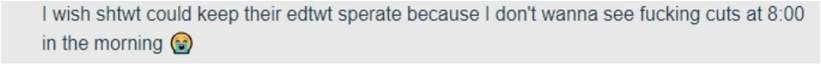 Después de sh*, 988* y beans*, las palabras más frecuentes son “ed*” y “gore*”. Este hallazgo es interesante porque ambas palabras pertenecen al dominio de otras comunidades en redes sociales, particularmente, de desórdenes alimenticios, como anorexia y bulimia (eating disorders) y gore, una tendencia de compartir contenido sensible explícito. La palabra clave que contiene la abreviación “ed*” es mencionada un total de 155 veces, lo que corresponde a un 15,5% de la muestra de 1.000 tweets. Por su parte, “gore*” es mencionada 114 veces (11,4%). Este resultado puede indicar que la comunidad de autolesiones se solapa o interactúa con otras comunidades digitales, en una relación que como explica Eckert (2006) en el contexto de las comunidades de práctica, puede ser armónica o conflictiva. En la Figura 4 se puede ver un ejemplo de la aparición de “ed*” en un tweet, en donde se muestra una relación conflictiva entre las dos comunidades.