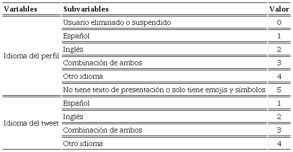 Como se muestra en la Tabla 1, la codificación del idioma se hizo identificando si el texto del perfil o del tweet está escrito en español, inglés, una combinación de ambos u otro idioma. Respecto al perfil, también se consideró la opción de que el usuario hubiese sido eliminado o suspendido (0), o cuando el perfil no tenga ninguna descripción textual, sino sólo símbolos o emojis. En ambos casos, no es posible identificar el idioma.