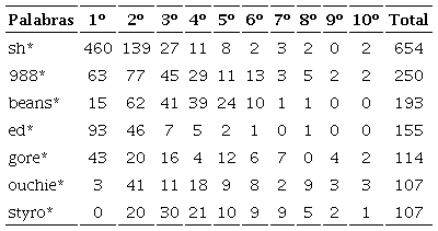 A partir del análisis de 1.000 tweets, es posible identificar que muchos tweets contenían más de una palabra clave, por lo que fueron codificadas en el orden de aparición en el texto. Como muestra la Tabla 4, las palabras más frecuentes (de acuerdo a la columna “total”) son aquellas que contienen la abreviación “sh*”, que hace referencia literal a las autolesiones. 654 tweets, es decir, el 65,4%, contiene esta formulación abreviada de self harm, usualmente acompañada de “twt” (shtwt), en referencia a Twitter. Esta abreviación es además la palabra que más se repite en la primera posición.