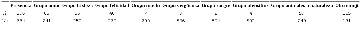 De los 1.000 tweets analizados, se identificó un variado uso de emojis. Estos son símbolos gráficos utilizados como un atajo para expresar conceptos e ideas. Son expresiones no verbales que no solo manifiestan sentimientos, como las expresiones faciales, sino también algunas actividades, el clima, objetos y banderas, entre otras (Kralj Novak et al., 2015). Emoji significa literalmente “personaje ilustrado” en japonés y se incorporó en dispositivos móviles de Japón a inicios de la década de 1990. Se difundieron en popularidad cuando Apple los incorporó a sus dispositivos (Kralj Novak et al., 2015) y desde ahí crecieron hasta ser utilizados en casi todas las plataformas de comunicación digital de mensajería instantánea y redes sociales (Pavalanathan & Eisenstein, 2015). El uso de emojis está estandarizado en Unicode, un sistema de codificación universal para diferentes dispositivos tecnológicos.
