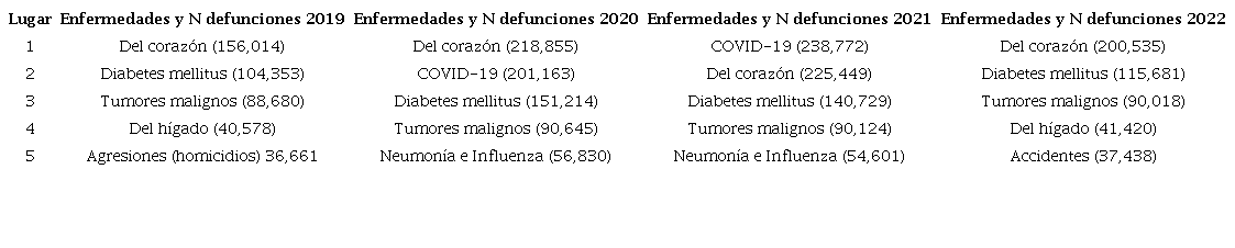 Suponemos que con base en estos primeros datos duros queda evidenciado, hacia finales de septiembre de 2023, que la pandemia de COVID-19 en México sí se había convertido en “algo terrible, fatal” y, por supuesto, que sí había sido algo más que una “crisis transitoria”, tal y como lo declaró el presidente López Obrador el 28 de febrero y el 2 de abril de 2020, respectivamente. Adicionalmente, no menos alarmante es el hecho de que la enfermedad se ubicó en 2020 en el segundo lugar como causa de mortalidad general en el país, ocupando el primero al siguiente año, mientras que pasó al sexto en 2022, de acuerdo con lo que se muestra en la Tabla 1, con datos aportados por el Instituto Nacional de Estadística, Geografía e Informática (INEGI) en nuestro país (INEGI, 2021a; 2022; 2023).