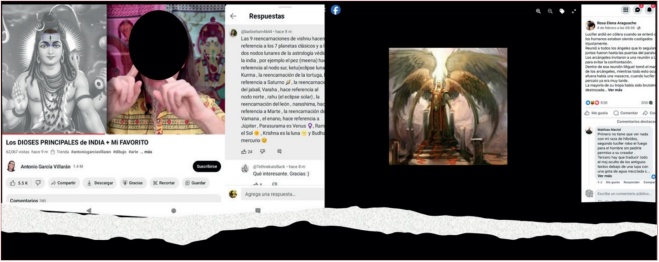 En la figura 2 se observa la representación de uno de los dioses indios, así como una figura alada, debajo de la cual se observa un Buda. En el primer caso, quien produce el contenido, responde a una pregunta de su comunidad: “Las 9 reencarnaciones de vishnu hacen referencia a los 7 planetas clásicos y a los dos mundos lunares de la astrología védica de la India”, lo que deja ver un dominio cultural para difundir este tipo de creencias, centrada en el significado de una forma de cosmogonía hindú. En el caso del ser alado, estamos ante la representación divinizada de Lucifer, tan propia en algunas comunidades digitales, muchas de las cuales comparten una representación que trastoca las convenciones, por la resignificación que de este personaje mítico hacen las comunidades de usuarios, quienes terminan por darle algunas veces un toque divinizado, y otras ven la encarnación del mal. En este caso, quien administra el sitio observa: “Lucifer ardió en cólera cuando se enteró que los humanos estaban siendo castigados injustamente…”, a partir de este planteamiento, despliega una exposición cuya fuente acredita sus dichos en El canto de los Dioses. La epopeya de Lucifer. La referencia es particularmente larga, lo que no impide el interés de su comunidad como para recibir más de 600 likes, 306 comentarios y que haya sido compartido en más de 120 ocasiones.