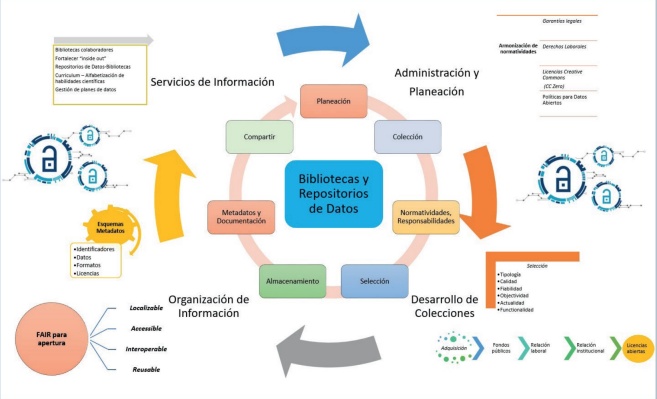 La finalidad de la función de administración y planificación de proyectos de ciencia abierta con apoyo de las bibliotecas será establecer bases de colaboración con los autores para formalizar su autorización y promover acuerdos en el marco de la legalidad de los derechos morales, patrimoniales y laborales para que las colecciones de datos abiertos están formalmente disponibles en accesos sin barreras en los repositorios de datos.