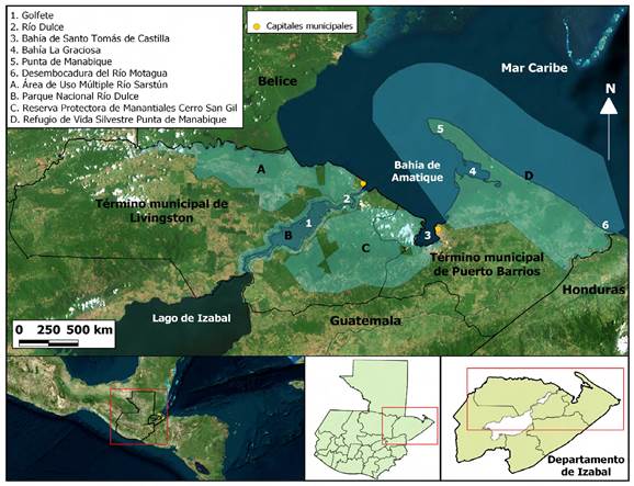 El ámbito de estudio se sitúa al noreste de América Central, entre Belice y Honduras (16º01’-15º43’; 88º36’-88º14’) (Figura 1). La longitud de costa es de 170 km, la superficie de la plataforma continental de 2 100 km2 y el área marina estimada de 10 000 km2(IARNA/URL, 2009). Este último dato está sujeto a la resolución de la delimitación marítima aún en disputa con países vecinos (Pérez et al., 2009). El área es geológicamente activa al ubicarse entre dos placas tectónicas: la de América del Norte y la del Caribe. Posee un clima tropical con temperatura media anual de 28.3 °C. La temporada de lluvias es de junio a septiembre y la estación seca de octubre a mayo, con una humedad relativa del 80 % (Yáñez-Arancibia et al., 1999). La pluviosidad puede alcanzar hasta los 3 500 mm anuales (FCG, 2012). El efecto del aporte de agua dulce sobre el ambiente marino es muy notorio y causa significativos y repentinos cambios en la salinidad y transparencia del agua (URL, 2004). El 34 % de las cuencas hidrográficas de Guatemala vierten al Caribe, destacando el río Motagua con 485 km de recorrido (Thattai et al., 2003).