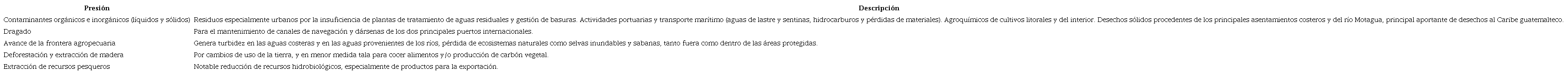 Las presiones causadas por las actividades económicas se presentan en el Cuadro 1. Varias de estas se han venido produciendo desde antes de la década de los 90 (Yáñez-Arancibia et al., 1999).