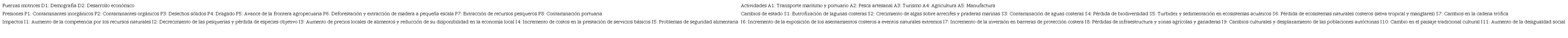 Según la Figura 2, las presiones con mayor intensidad en el sistema son aquellas relacionadas con contaminación (P1, P2, P3, P8). Por otro lado, las presiones generan cambios de estado principalmente relacionados con cambios sobre la biodiversidad (S4). Generalmente, los problemas analizados han causado una pérdida significativa de capital natural y, por tanto, de calidad de vida de las comunidades costeras.